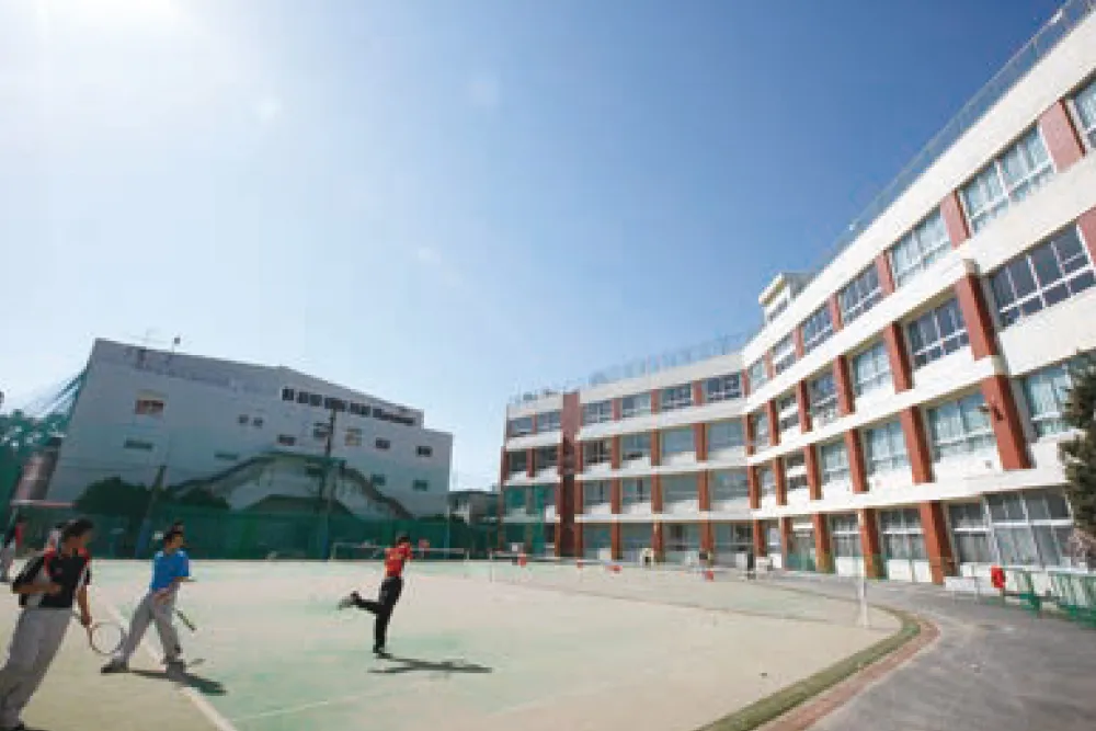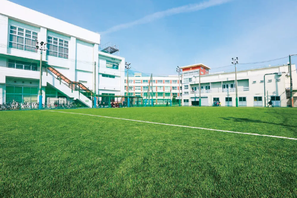 ケガや泥汚れを心配することなく、のびのびと運動に専念できる人工芝。昼休みや放課後の部活動の時間には、生徒たちのいきいきとした表情でいっぱいになります。
