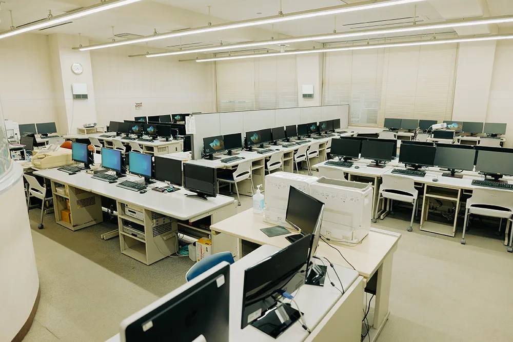 コンピューター教育の充実のために設置された実習室は2つ。いずれも最新型端末を50台備えています。専任教諭が常駐しているため、授業時間外の利用も自由です。