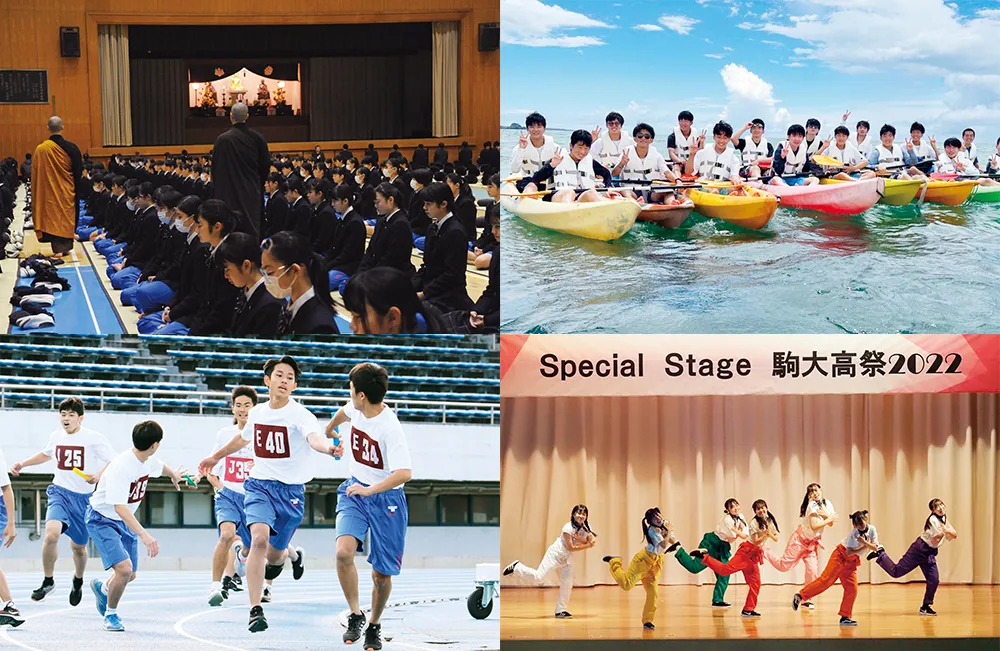 陸上競技大会(体育祭)や駒大高祭(文化祭)など、一般的な行事に加えて宗教行事や受験行事なども開催。多種多彩なイベントを通して、行動力や自主性がのびやかに育ちます。本校の特徴でもある宗教行事は、校内で坐禅を組んだり、永平寺で行う1泊2日の参禅修行他。自分自身と向き合い、心を磨きます。